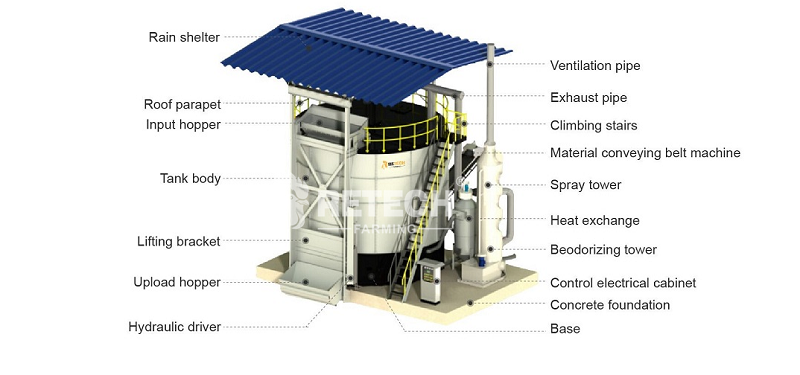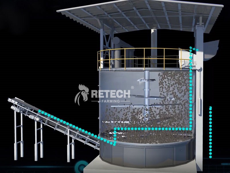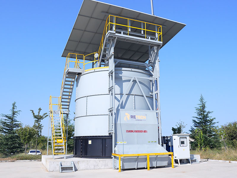 During fermentation, the internal temperature of Retech's energy-saving fermentation tank can reach over 60 degrees, which can effectively kill pathogens, insect eggs and plant seeds, etc. A biological deodorization tower is set up, and the waste gas generated during the fermentation process is treated by the deodorization tower and discharged through the exhaust pipe after passing through the filtering device, which can effectively reduce the content of harmful gases.